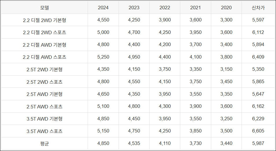 2.5T 2WD 스포츠 | 4,800 | 4,550 | 4,150 | 3,750 | 3,450 | 5,865 |