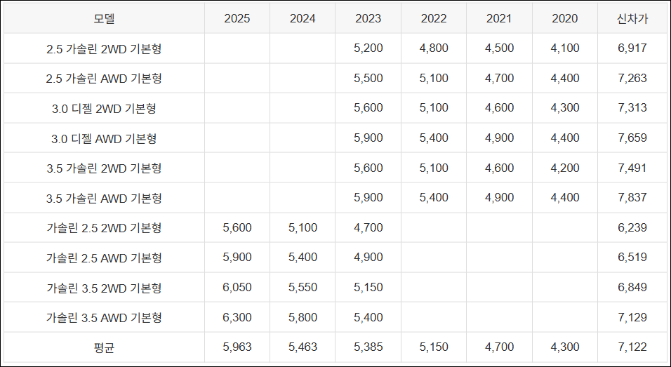 | 2.5 가솔린 AWD 기본형 | 5,500 | 5,100 | 4,700 | 4,400 | 7,263 | ||