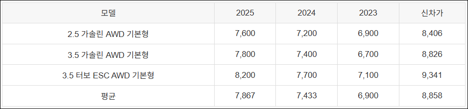 | 2.5 가솔린 AWD 기본형 | 7,600 | 7,200 | 6,900 | 8,406 |