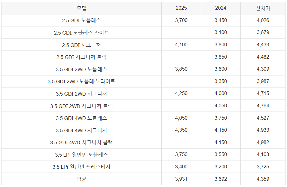 | 2.5 GDI 노블레스 | 3,700 | 3,450 | 4,026 |