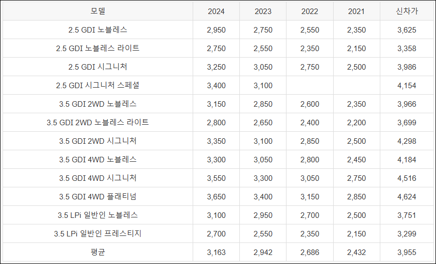 | 2.5 GDI 시그니처 | 3,250 | 3,050 | 2,750 | 2,500 | 3,986 |