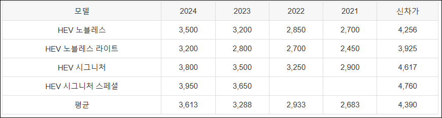 | HEV 노블레스 | 3,500 | 3,200 | 2,850 | 2,700 | 4,256 |