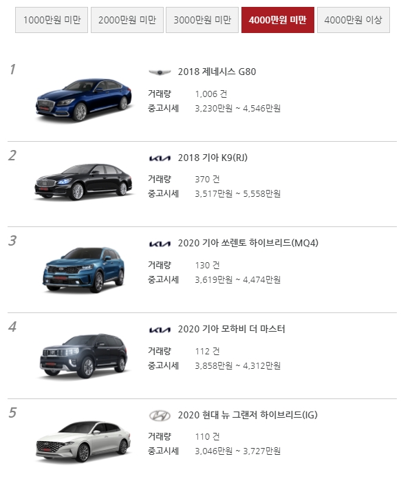 4000만원 미만 중고차 순위 (중고차 가격 시세표 요약)