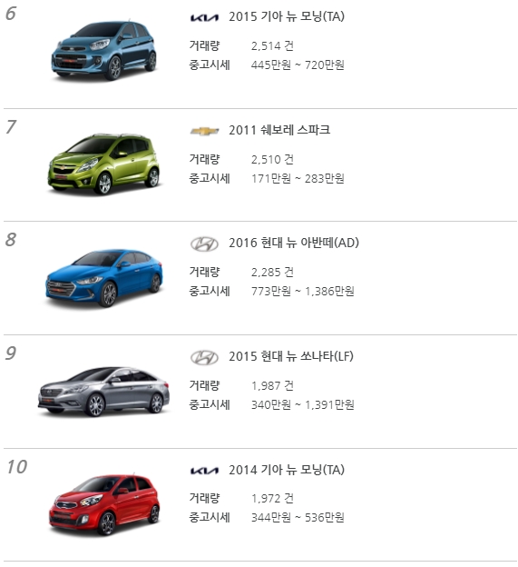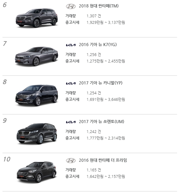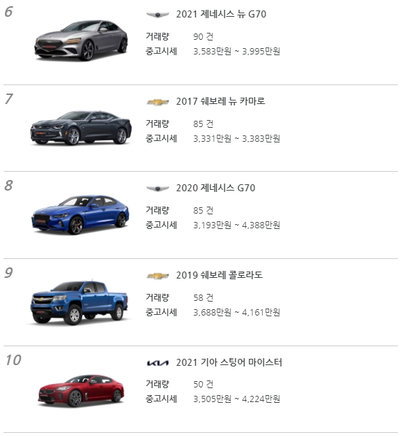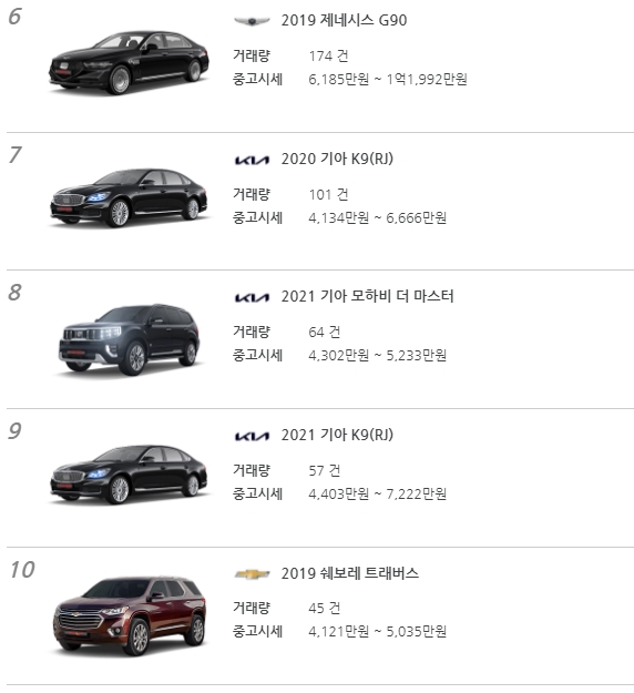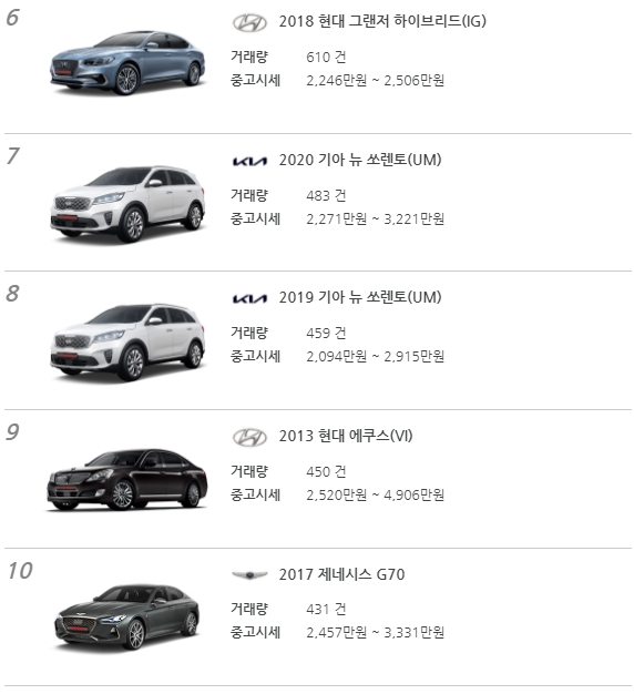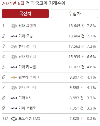 21년 6월 국산차 중고차 거래순위 (중고차 가격 시세표 요약)