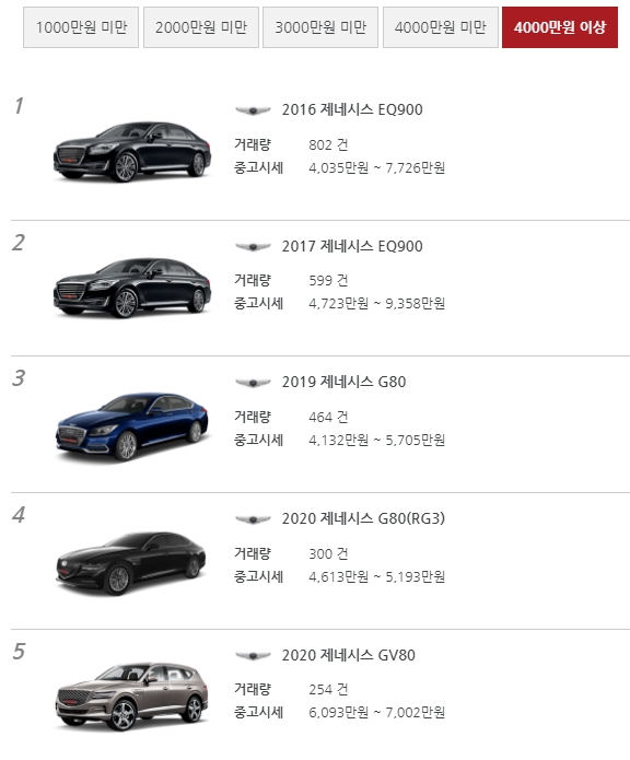 4000만원 이상 중고차 순위 (중고차 가격 시세표 요약)