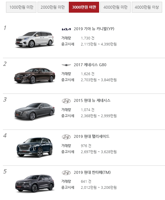 3000만원 미만 중고차 순위 (중고차 가격 시세표 요약)