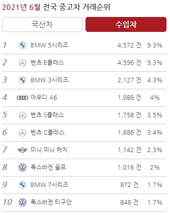 21년 6월 수입차 중고차 거래순위 (중고차 가격 시세표 요약)