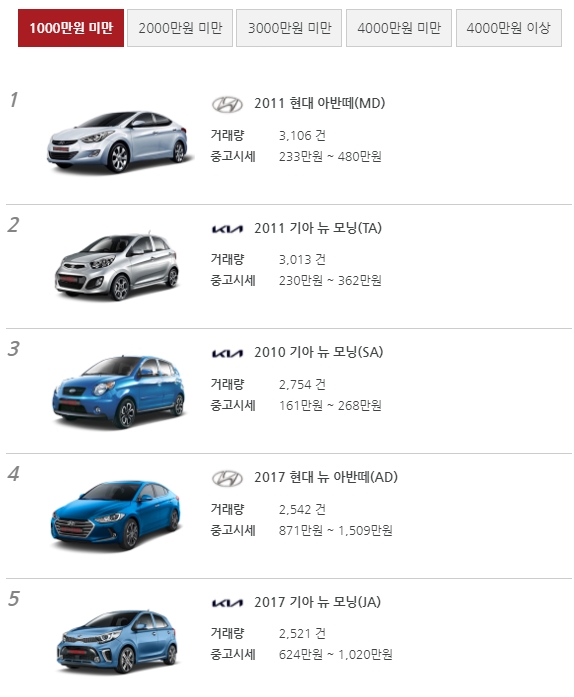 1000만원 미만 중고차 순위 (중고차 가격 시세표 요약)