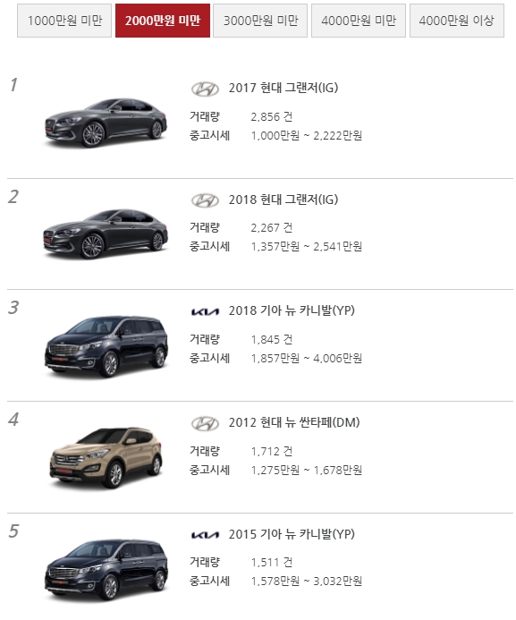 2000만원 미만 중고차 순위 (중고차 가격 시세표 요약)