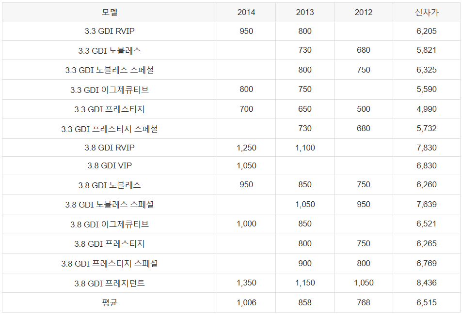 | 3.3 GDI 프레스티지 | 1,500 | 1,300 | 1,150 | 1000 | 850 | 5,060 |