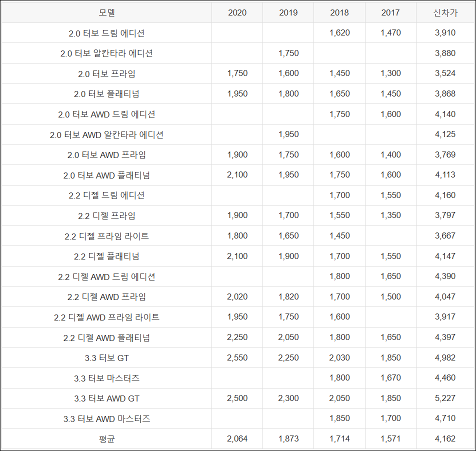 | 2.2 디젤 AWD 프라임 | 2,020 | 1,820 | 1,700 | 1,500 | 4,047 |
