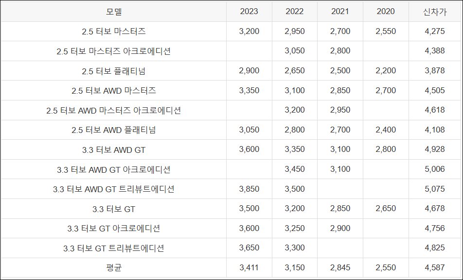 | 3.3 터보 AWD GT | 3,600 | 3,350 | 3,100 | 2,800 | 4,928 |