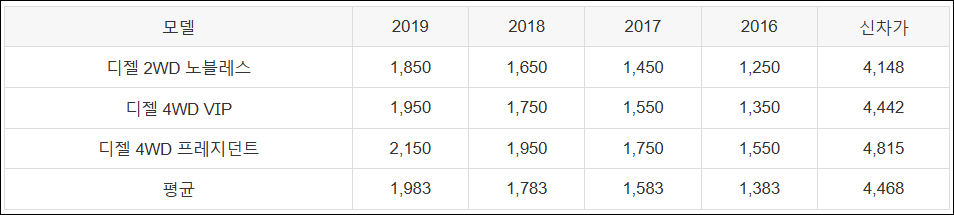 디젤 4WD 프레지던트 | 2,150 | 1,950 | 1,750 | 1,550 | 4,815 |