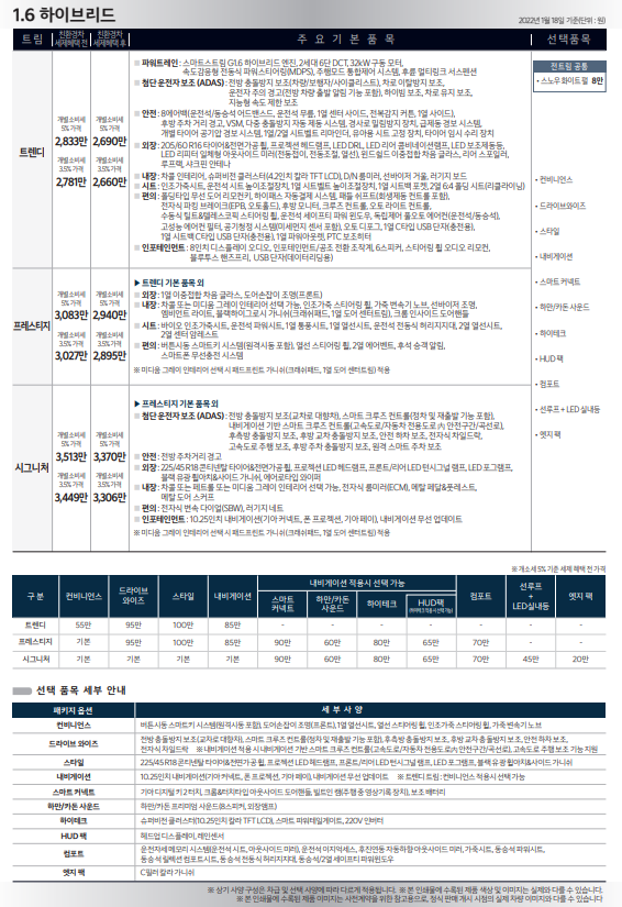 C필러와 백펜더를 덮는 라인이 다른 색상으로 적용된 투톤 형태라는 점이 상당히 이례적이며, 사람들의 호불호를 제외하면 전작보다 디자인 리뷰가 확연히 좋아졌습니다. 하지만 색상을 통일할 수 있는 옵션도 있습니다. 2022년 연간 생산계획은 1만5000대 정도로 상당히 열악합니다. 사전계약은 2022년 1월 18일부터 시행되며 25일 정식 출시될 예정입니다. 하이브리드 모델은 1세대에도 장착했던 카파 1.6L GDi 엔진+전기 모터 조합의 하이브리드 시스템을 개선해 연비를 소폭 높였다는 평가를 받고 있습니다. 총 길이는 65mm 늘어난 4,420mm, 휠 베이스는 20mm 늘어난 2,720mm입니다. 향후(13대)에는 단종된 K5 택시를 대체하는 EV 모델을 기반으로 한 택시 전용 모델도 출시할 예정입니다.