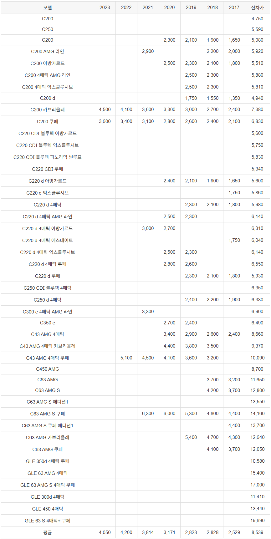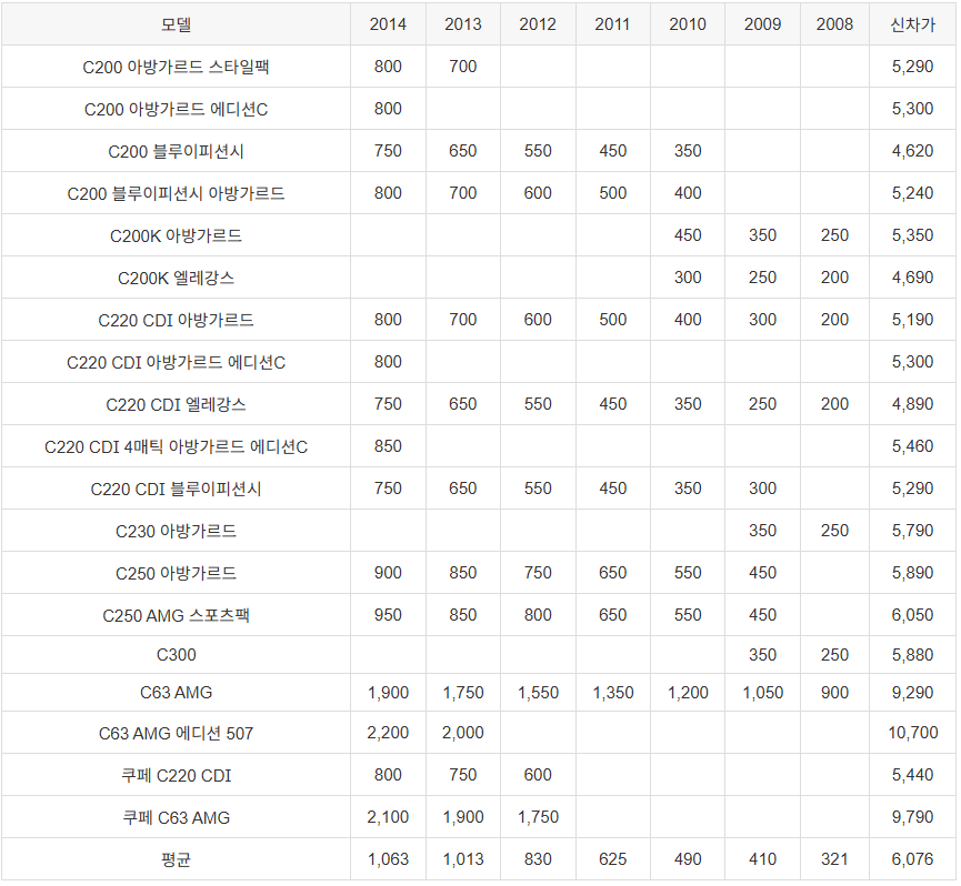 이상으로 벤츠 C클래스 중고차 가격 시세표 알아보았습니다. 작성일 기준으로 된 중고차 가격입니다. 감사합니다.