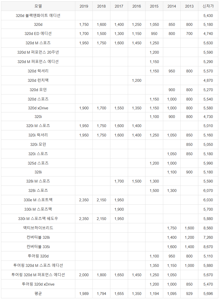 이상으로 BMW 3시리즈 중고차 가격 시세표 알아보았습니다. 작성일 기준으로 된 중고차 가격입니다. 감사합니다.