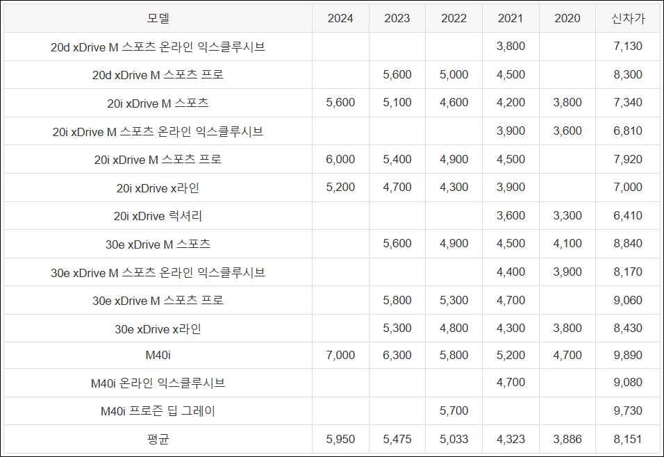 | 20i xDrive x라인 | 5,200 | 4,700 | 4,300 | 3,900 | 7,000 | |