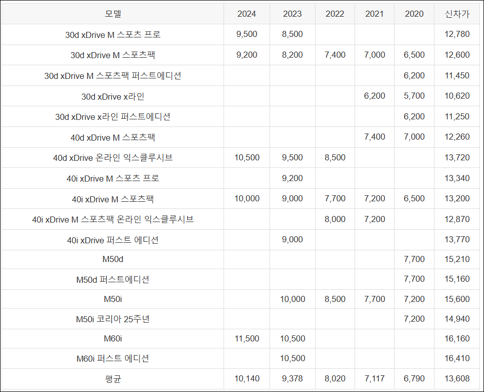 | 40i xDrive M 스포츠팩 | 10,000 | 9,000 | 7,700 | 7,200 | 6,500 | 13,200 |