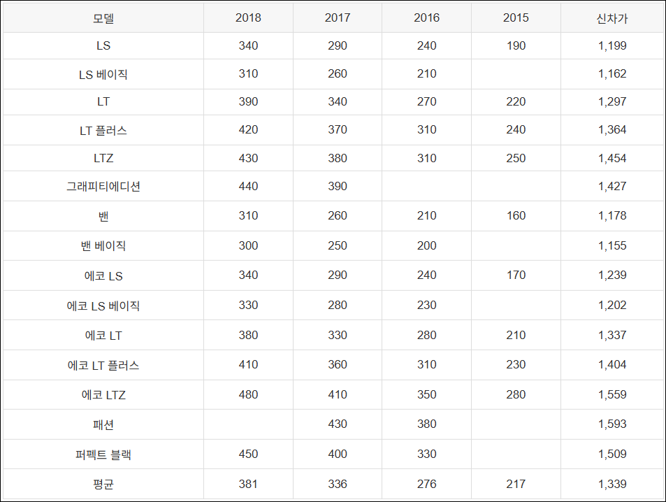 | 모델 | 2018 | 2017 | 2016 | 2015 | 신차가 |