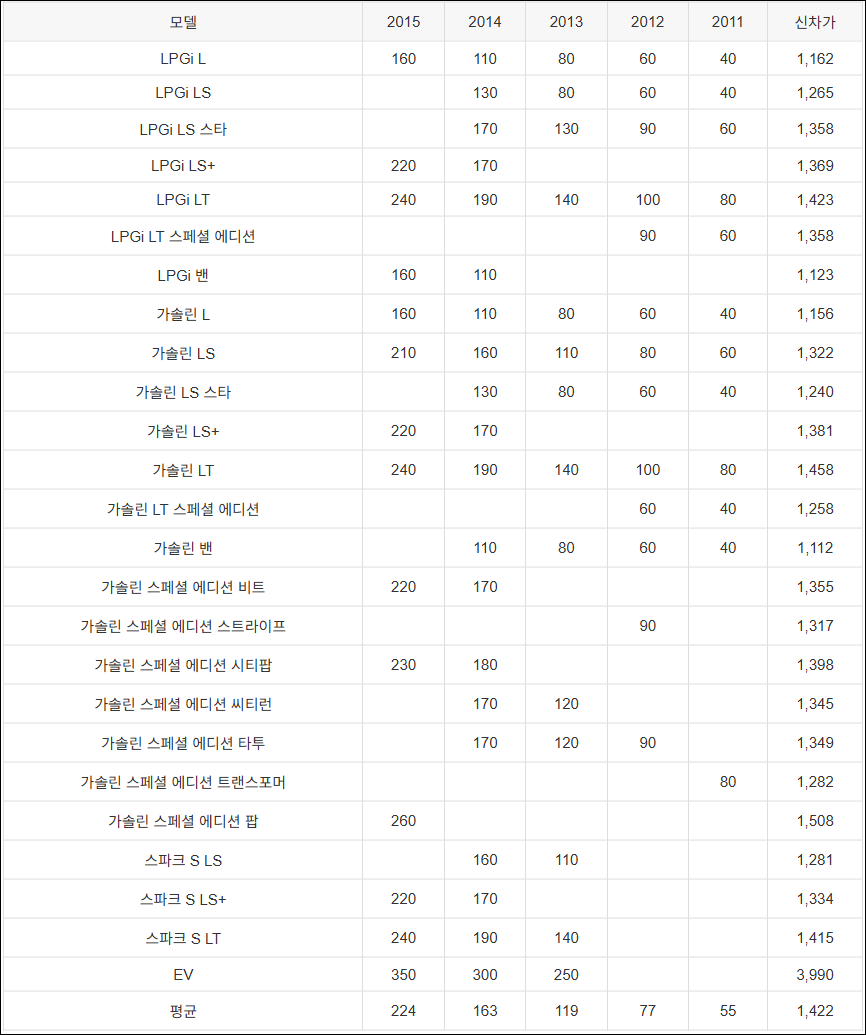 2011년부터 2015년까지 출시한 스파크 중고차 가격은 평균 2015년식 224만원, 2014년식 163만원, 2013년식 119만원, 2012년식 77만원, 2011년식 55만원입니다.