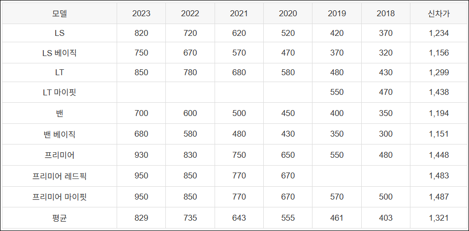 | 모델 | 2023 | 2022 | 2021 | 2020 | 2019 | 2018 | 신차가 |