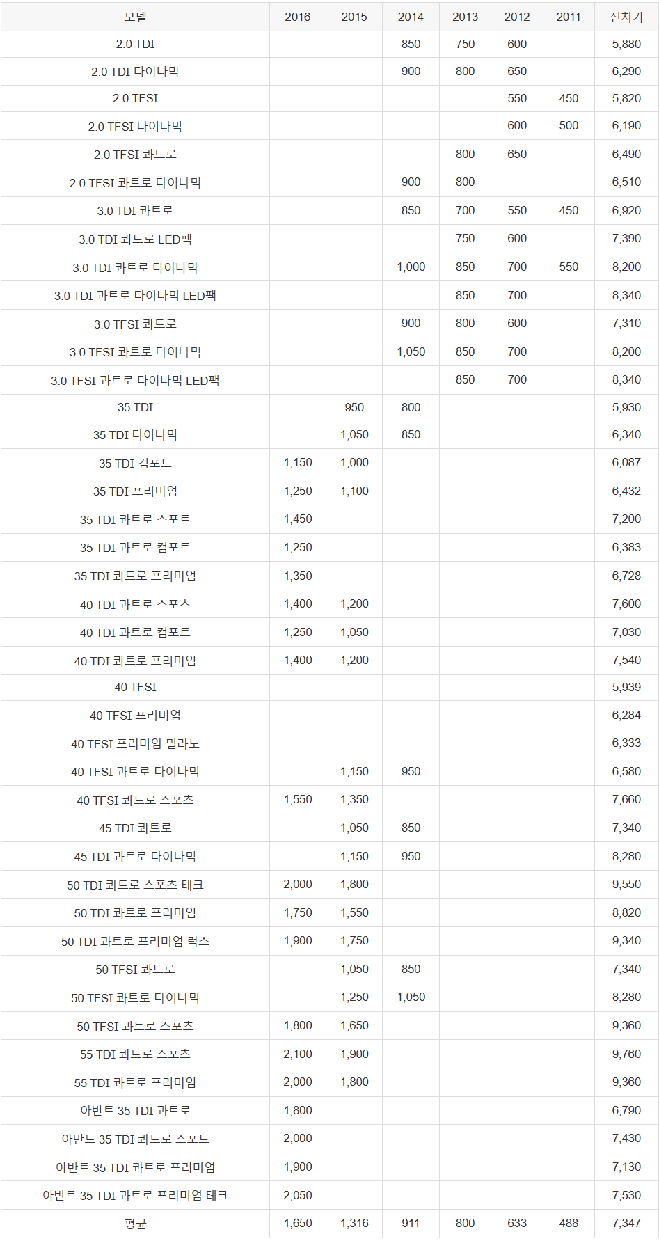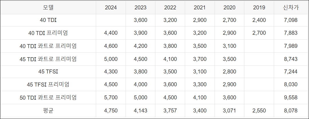 | 45 TDI 콰트로 프리미엄 | 5,000 | 4,500 | 4,100 | 3,700 | 3,500 | 8,743 | |