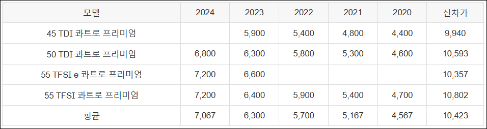 | 50 TDI 콰트로 프리미엄 | 6,800 | 6,300 | 5,800 | 5,300 | 4,600 | 10,593 |