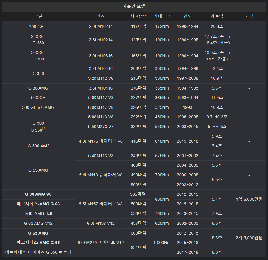 독일 자동차 브랜드 메르세데스 벤츠가 판매하는 차체 온 프레임 타입 4WD 중형 SUV입니다. G-클래스의 공식 명칭은 1994년부터 사용되었습니다. G는 Gelnde의 약자로, 벤츠가 직접 생산하지 않고 오스트리아의 자동차 부품 제조업체인 마그나 슈타이어가 위탁 생산합니다. 원래 군용차로 출시됐다가 1979년 민간 차량(W460)으로 출시됐고, 현재 3세대(W464)로 2018년에 출시됐습니다. 지프 랭글러와 같은 군용차였던 이 차는 압도적인 외형 덕분에 문화적으로 인기 있는 SUV입니다. 유선형의 디자인이 많은 현대 자동차 시장에서는 흔치 않은 각진 외관이 독특한 힘을 발산해 호불호가 갈리지만, 대체로 전통을 멋지게 살렸다는 평가를 받고 있습니다. 1979년 첫 출시 이후 디자인 자체에 변화가 거의 없는 진정한 '마스터카'로 자리 잡았습니다.