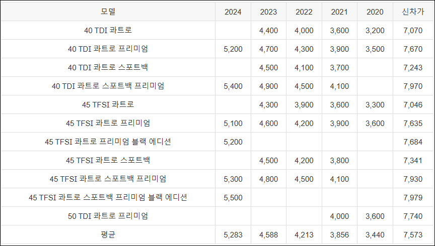 | 40 TDI 콰트로 스포트백 프리미엄 | 5,400 | 4,900 | 4,500 | 4,100 | 7,970 | |