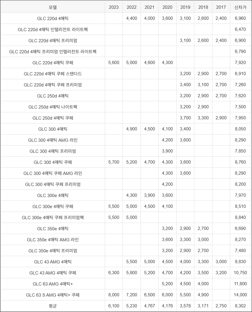 | GLC 43 AMG 4매틱 | 5,500 | 5,000 | 4,500 | 4,000 | 3,300 | 3,000 | 9,830 | |