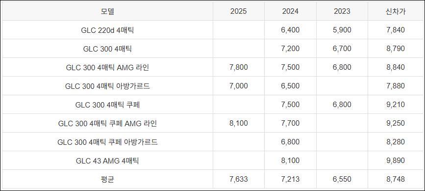 벤츠 GLC 2세대 중고차 가격은 평균 2025년식 7633만원, 2024년식 7213만원, 2023년식 6550만원입니다.