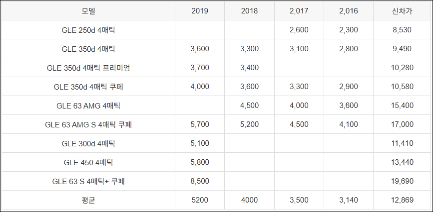 2016년부터 2019년까지 출시한 벤츠 GLE 1세대 중고차 가격은 평균 2019년식 5200만원, 2018년식 4000만원, 2017년식 3500만원, 2016년식 3140만원 입니다.