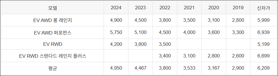 | EV AWD 롱 레인지 | 4,900 | 4,500 | 3,800 | 3,500 | 3,100 | 2,800 | 5,999 |