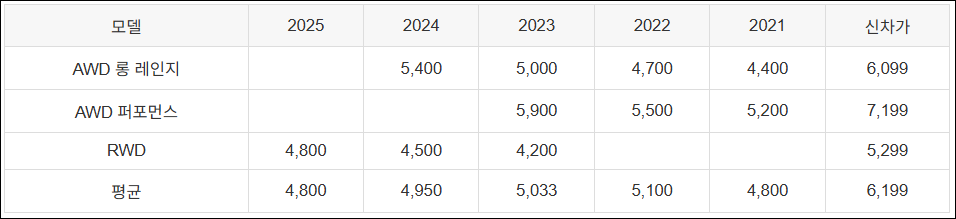 | 모델 | 2025 | 2024 | 2023 | 2022 | 2021 | 신차가 |