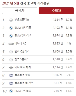 1위는 벤츠 e클래스, 2위는 bmw 5시리즈, 3위 bmw 3시리즈,4위 아우디 a6, 5위 벤츠 c클래스, 6위 벤츠s클래스, 7위 미니 미니해치, 8위 폭스바겐 골프, 9위 폭스바겐 티구안, 10위 bmw 7시리즈 입니다.