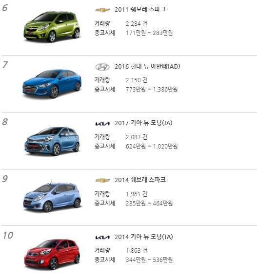 1000만원 미만 중고차 6~10위는 2011년식 스파크, 2016년식 아반떼 모닝 등이 있습니다.