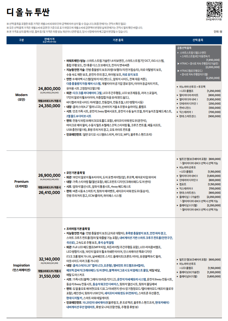 아래는 투싼 가격표입니다.