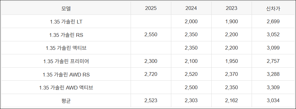 | 모델 | 2025 | 2024 | 2023 | 신차가 |