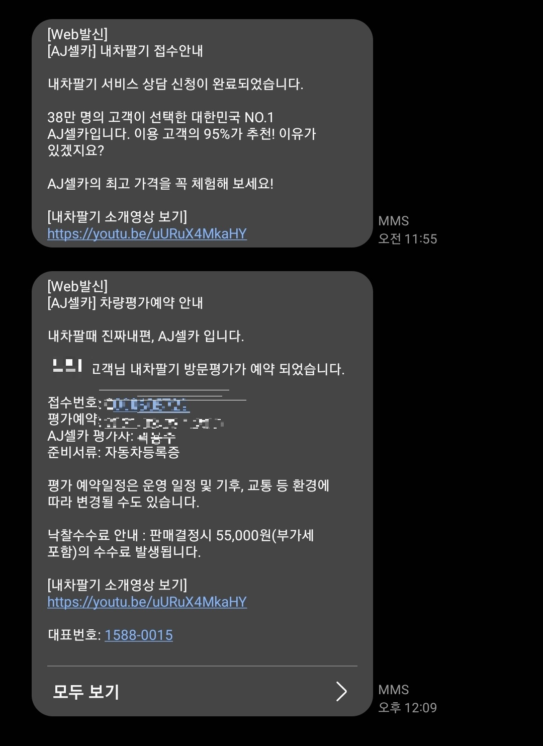 링크 접속 후 아래쪽에 차량번호, 휴대폰번호를 남기게 되면 상담사가 전화를 통해 접수를 하게됩니다. 그러면 차량 평가사가 연락이오게되어 내 중고 차량을 평가할 시간 예약 잡습니다.