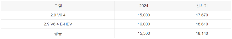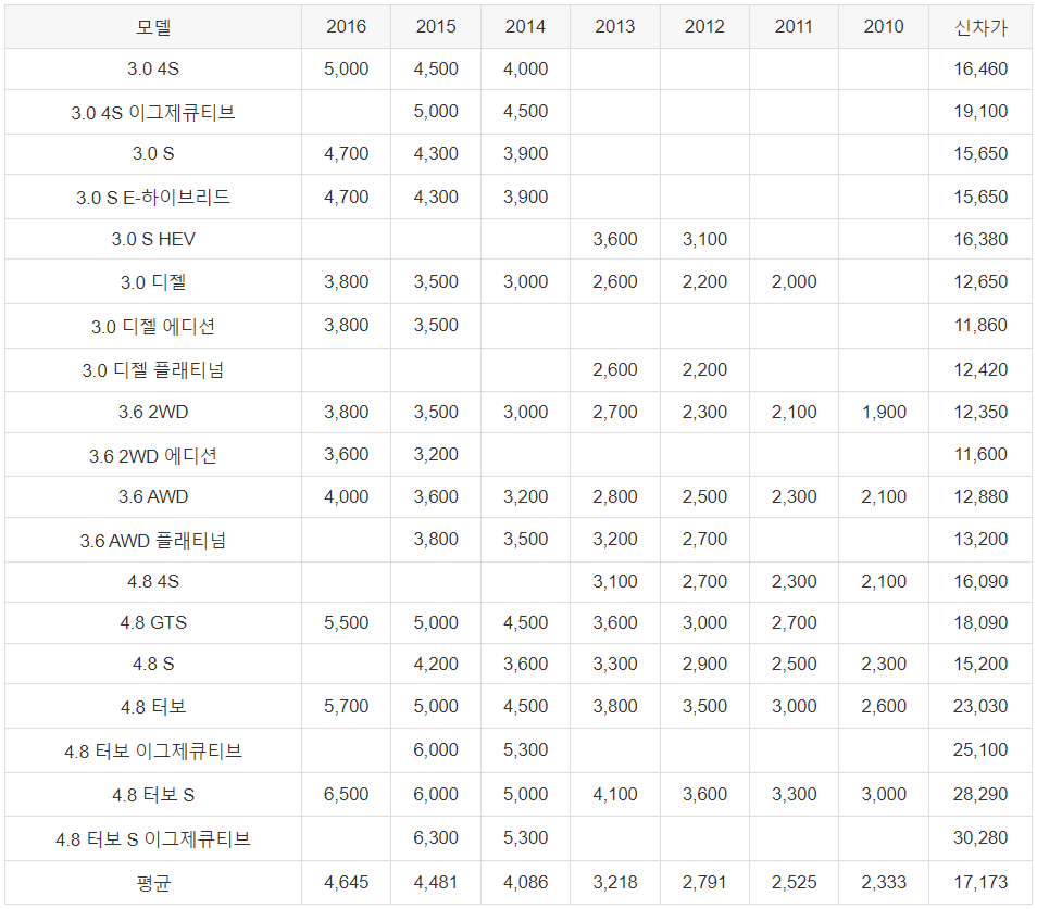 | 4.0 터보 | 19,500 | 17,500 | 15,500 | 14,000 | 12,000 | 10,500 | 9,000 | 24,820 |