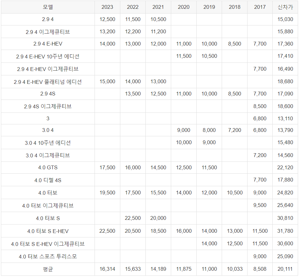 | 4.0 터보 S E-HEV | 22,500 | 20,500 | 18,500 | 16,000 | 14,000 | 13,000 | 11,500 | 31,780 |