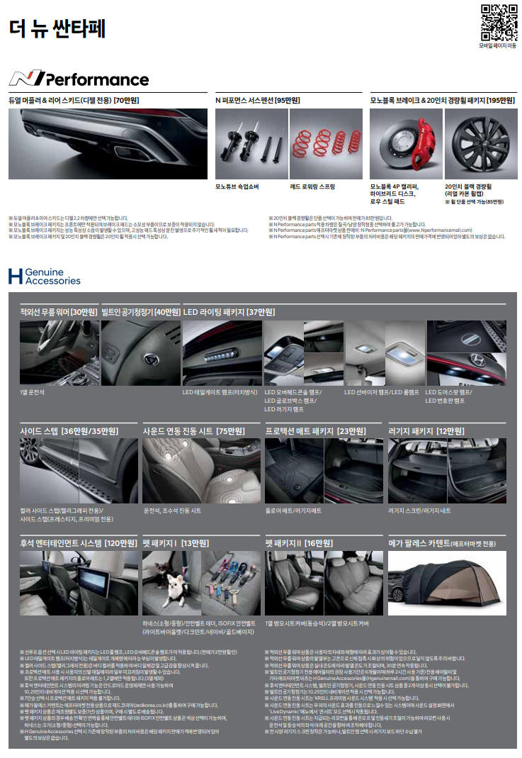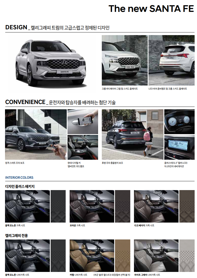 - 외부 색상은 글레이셔 화이트, 티에가 브라운, 라군 블루, 화이트 크림, 마그네틱 포스, 팬텀 블랙, 라바 오렌지, 레인 포레스트(서예 트림 전용) 등 8가지이며 외부 색상은 블랙 원톤, 다크 베이지, 브라운, 카멜(서예 트림 전용) 등 5가지입니다. 앞으로 커스터마이징 브랜드인 H 정품 액세서리도 더 뉴 산타페 전용 제품을 출시할 예정입니다.