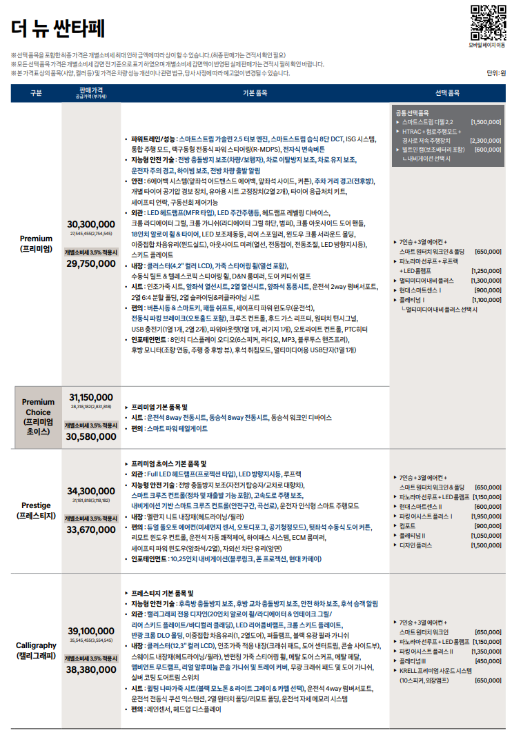 아래는 너 뉴 싼타페 옵션 가격 내용입니다.