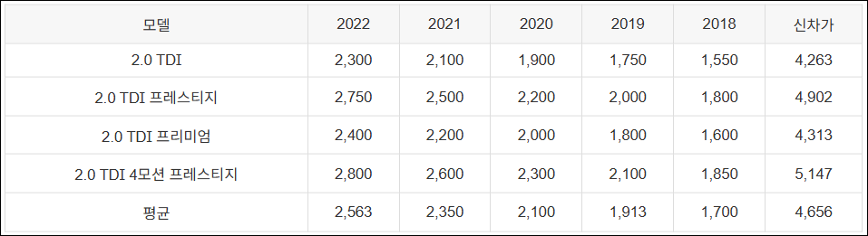 | 2.0 TDI 4모션 프레스티지 | 2,800 | 2,600 | 2,300 | 2,100 | 1,850 | 5,147 |