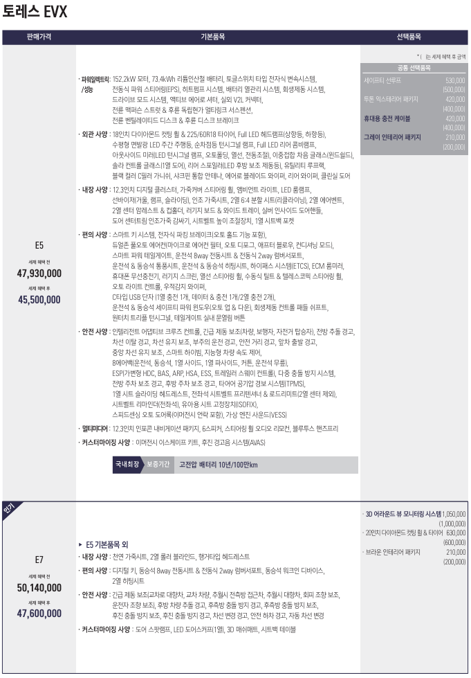 토레스 전기차 가격은 E5 4550만원, E7 4760만원 입니다. 옵션을 추가하면 가격이 상승합니다.