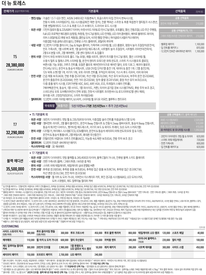 2025 토레스 가격은 T5트림 2838만원, T7트림 3229만원, 블랙 에디션 3550만원 입니다. 옵션을 추가하면 가격이 상승하게 됩니다.