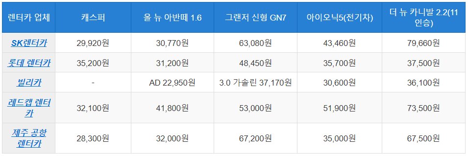 본문에 직접 제주도 렌트카 업체별로 가격비교를 해보았습니다. 확인해보시기 바랍니다.