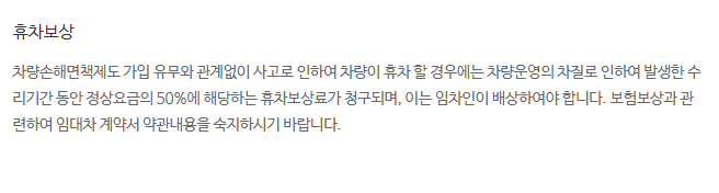 휴차 보상 : 차량 손해 발생 시 수리기간동안 대여요금의 50%에 해당하는 휴차 보상료가 청구되면, 이는 고객님이 배상해야 합니다.