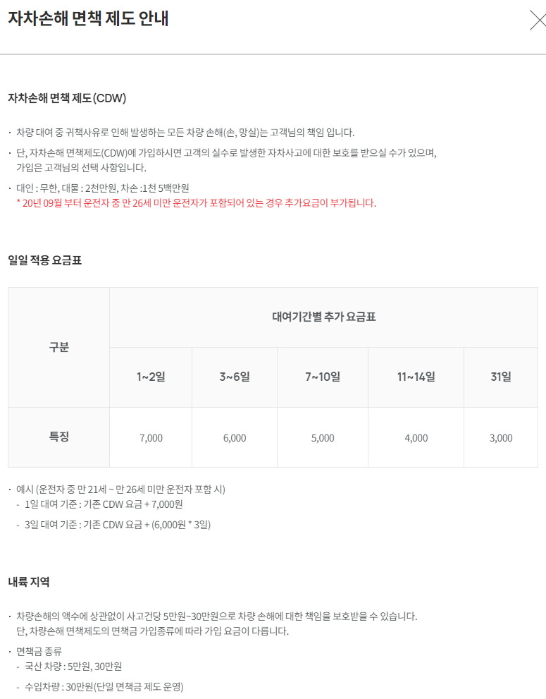 * 20년 09월 부터 운전자 중 만 26세 미만 운전자가 포함되어 있는 경우 추가요금이 부가됩니다.