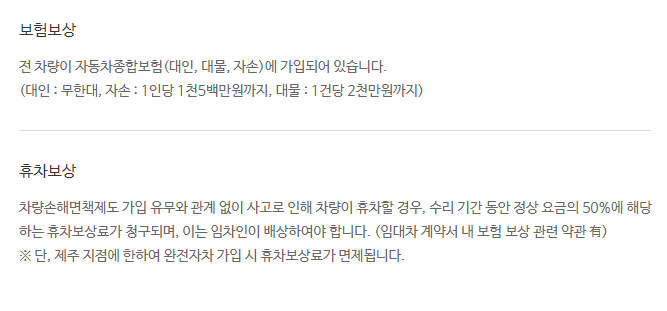 전 차량이 자동차종합보험(대인, 대물, 자손)에 가입되어 있습니다. (대인 : 무한대, 자손 : 1인당 1천5백만원까지, 대물 : 1건당 2천만원까지)